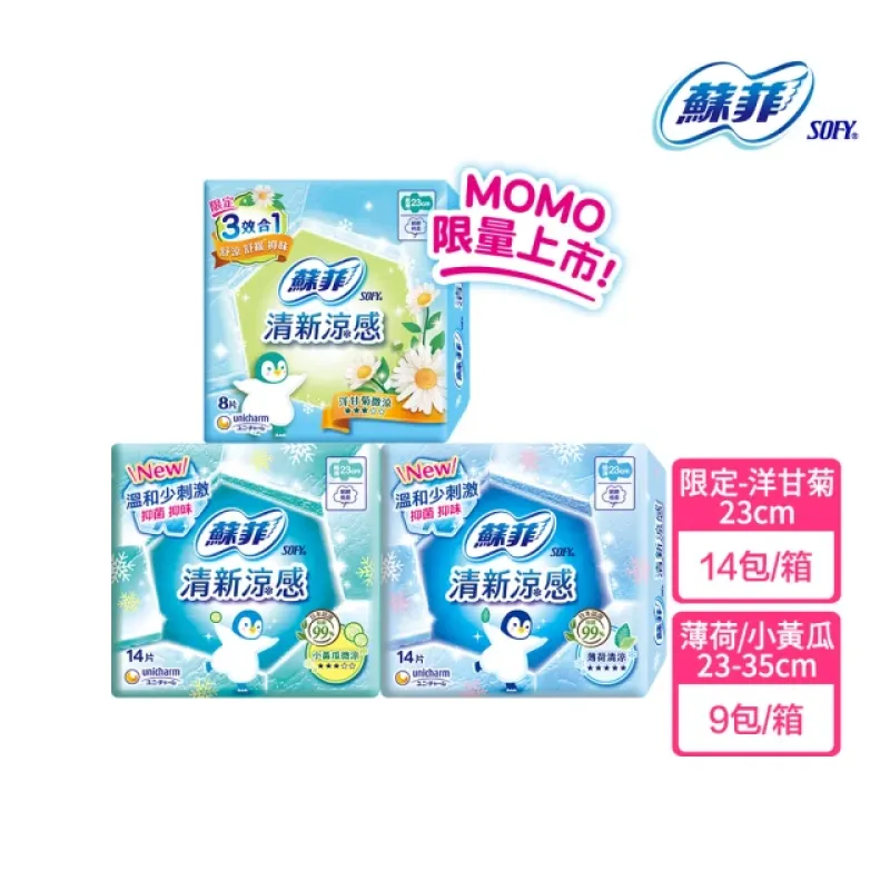 蘇菲-清新涼感薄荷/小黃瓜/甘菊衛生棉箱購(23cm126片、洋甘菊112片/25cm117片/29cm108片/35cm81片)